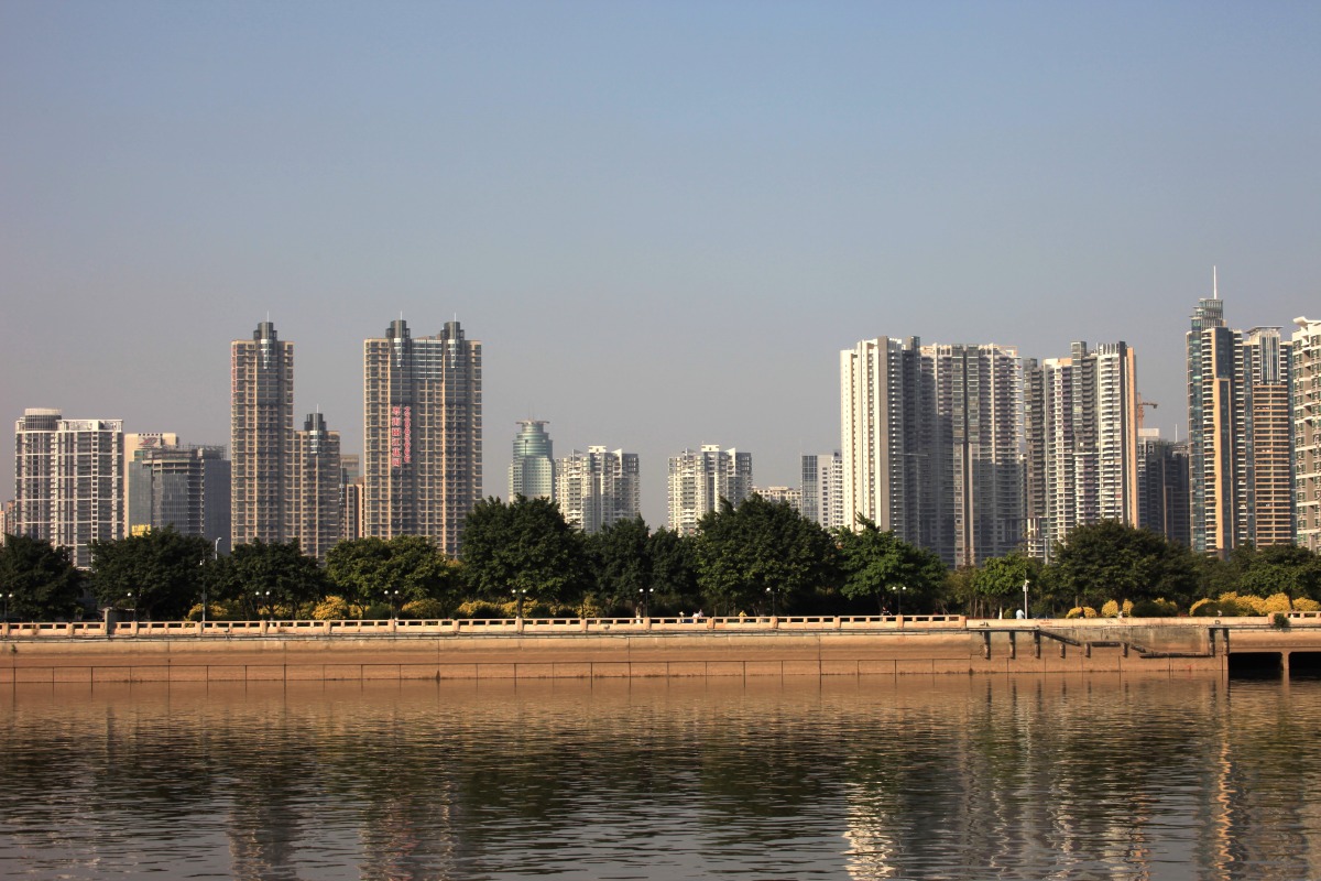 別な場所から同方向の眺めです。 手前のタワーマンション群が低く感じます。 「広州国際金融センター」の左の超高層ビルは 「富力中心(R&F Centre)」で地上54階、高さ243.1mです。 普通は主役級の高さですがここでは脇役です。。 |