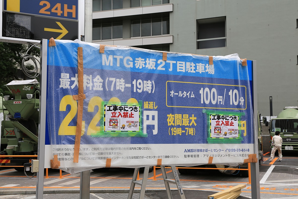 駐車場名は「MTG赤坂2丁目駐車場」で、駐車料金は10分100円、7時〜19時の最大料金は2200円、そして夜間最大料金は見えませんでした。最大料金のところに繰返しと書いてありますが、初回だけ最大料金を設定して、その後は適用されない詐欺まがいの駐車場が多いらしいので、ここそういったことはないアピールだと思われます。