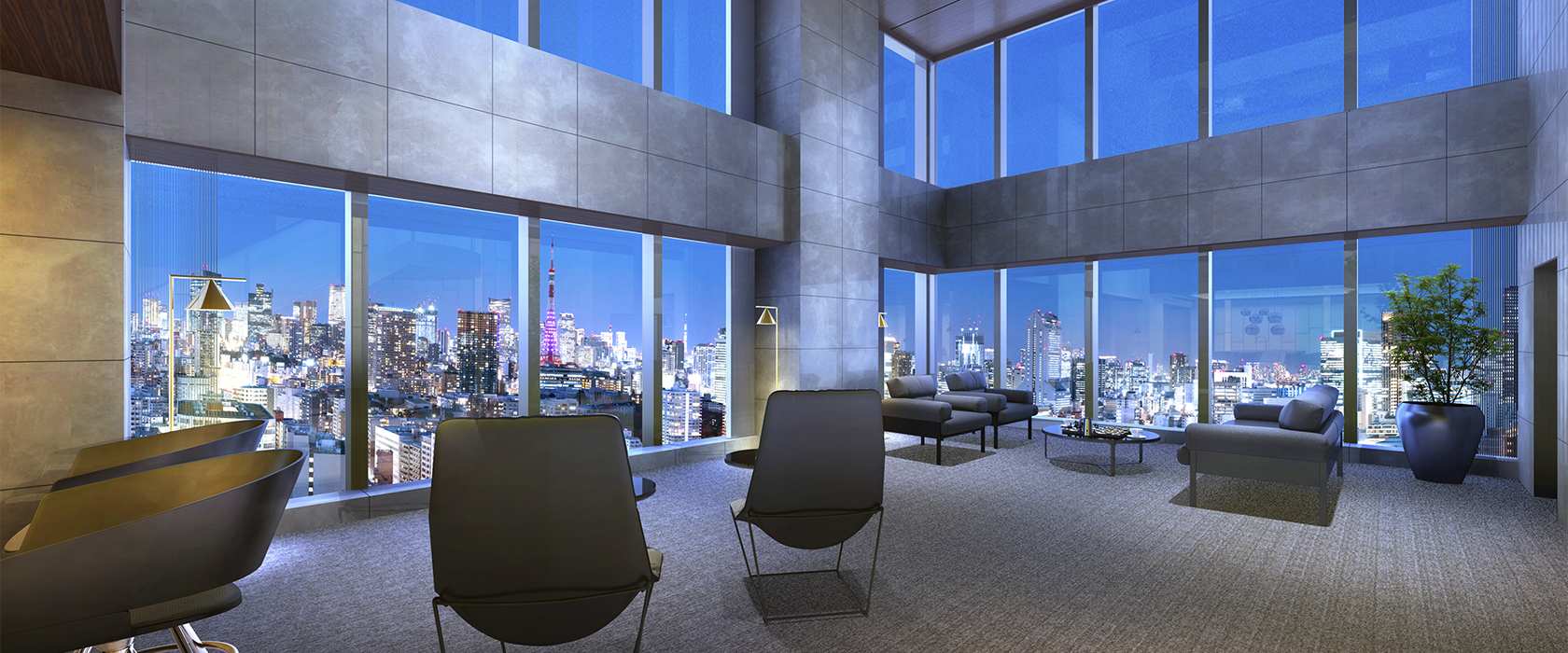 ¡¡Çò¶â¤Ç·úÀßÃæ¤Î¥¿¥ï¡¼¥Þ¥ó¥·¥ç¥ó¡ÖSHIROKANE The SKY(Çò¶â¥¶¡¦¥¹¥«¥¤)¡×(ÃϾå45³¬¡¢¹â¤µ156.10m)¤Î´°À®Í½ÁۿޤǤ¹¡£