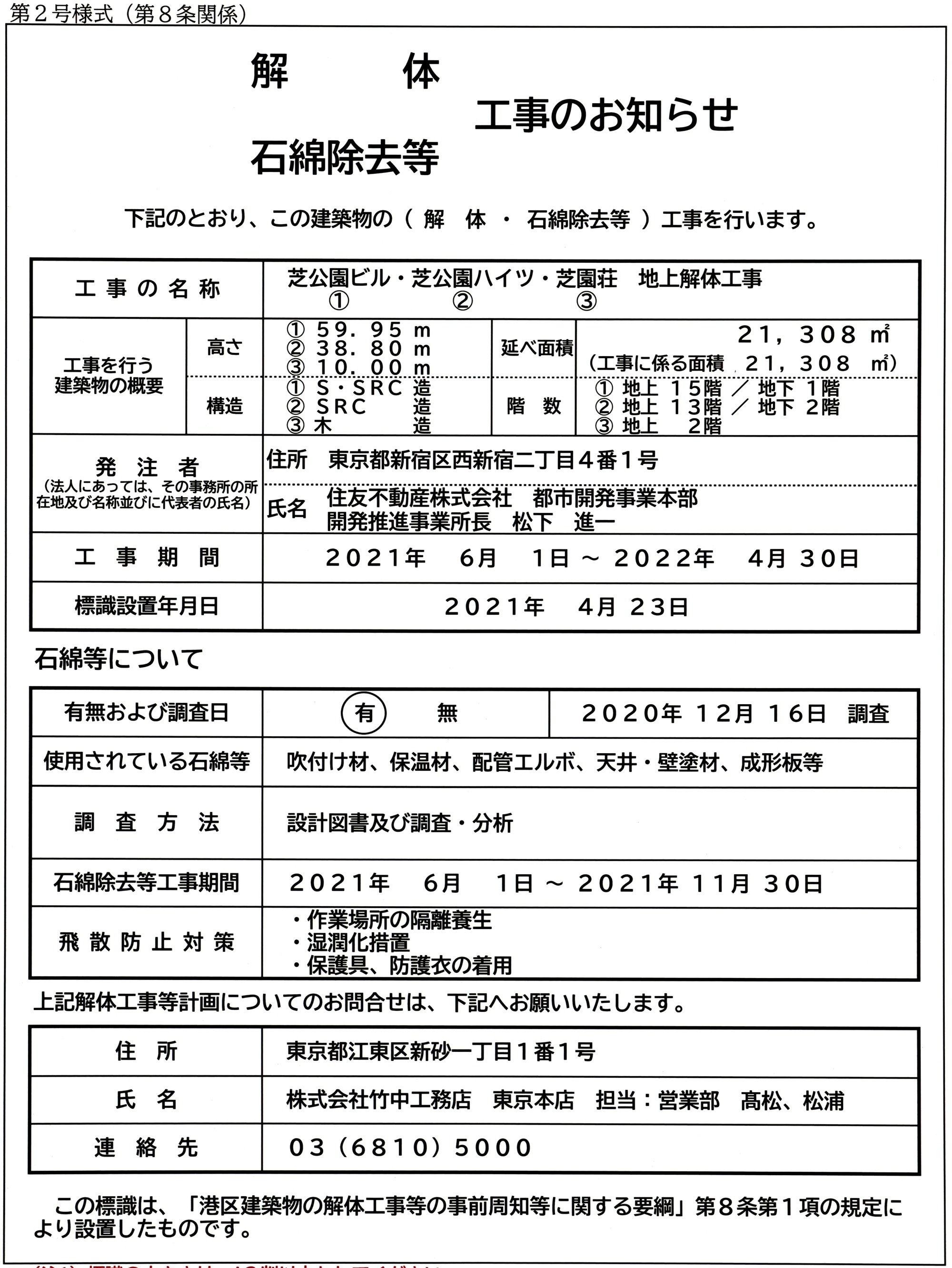 都営三田線「芝公園」駅前に新規の超高層オフィスビル「(仮称)芝二丁目計画」(地上21階、高さ120m)が建設されることが建築計画のお知らせより判明しました。建築主は住友不動産で2023年5月22日着工、2025年7月15日竣工予定となっています。この記事では同ビルの概要や既存建物解体状況、地図等を載せています。