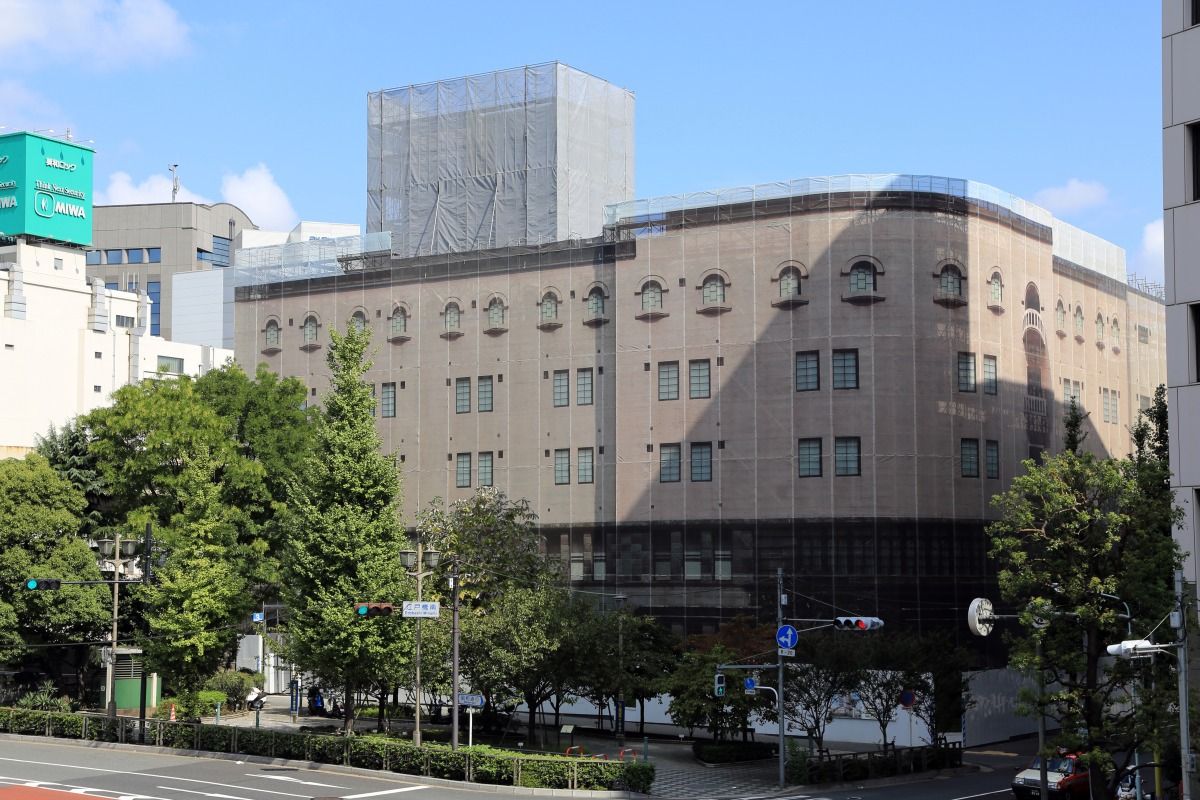 囲いに「江戸橋倉庫ビル」の外壁が描かれていますが